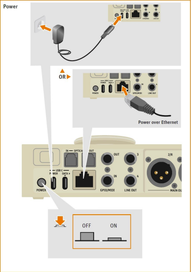 To power the interface, connect the included power supply to the USB slot labeled Power on the back of your MT48.
