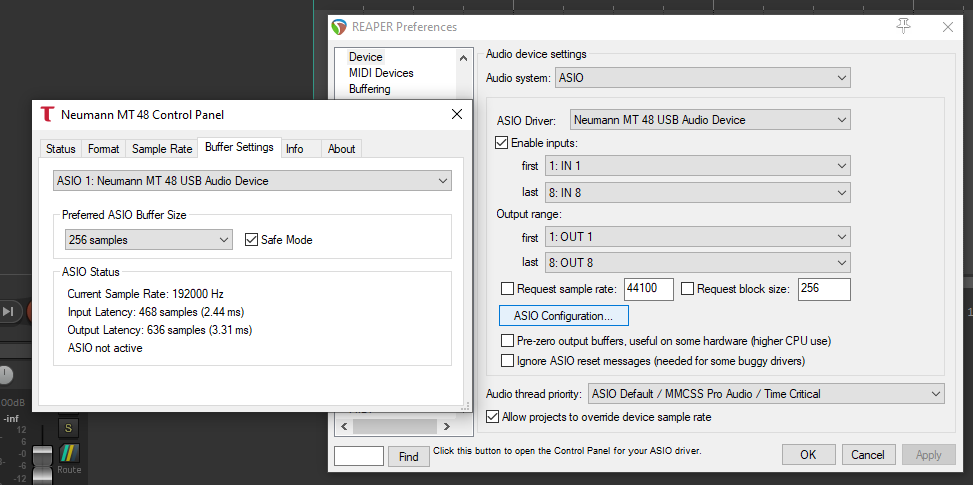 If you incur latency while recording, this can be adjusted by hitting the ASIO Configuration in the Options > Preference > Devices menu, which opens the Neumann MT 48 Control Panel. The Preferred ASIO Buffer Size (increasing or decreasing) will impact latency.
