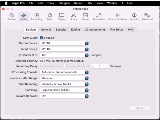 1. First, go to Logic Pro > Preferences > Audio and ensure Core Audio is Enabled. Select the MT 48 as both your Output Device and Input Device and click Apply to save any changes.