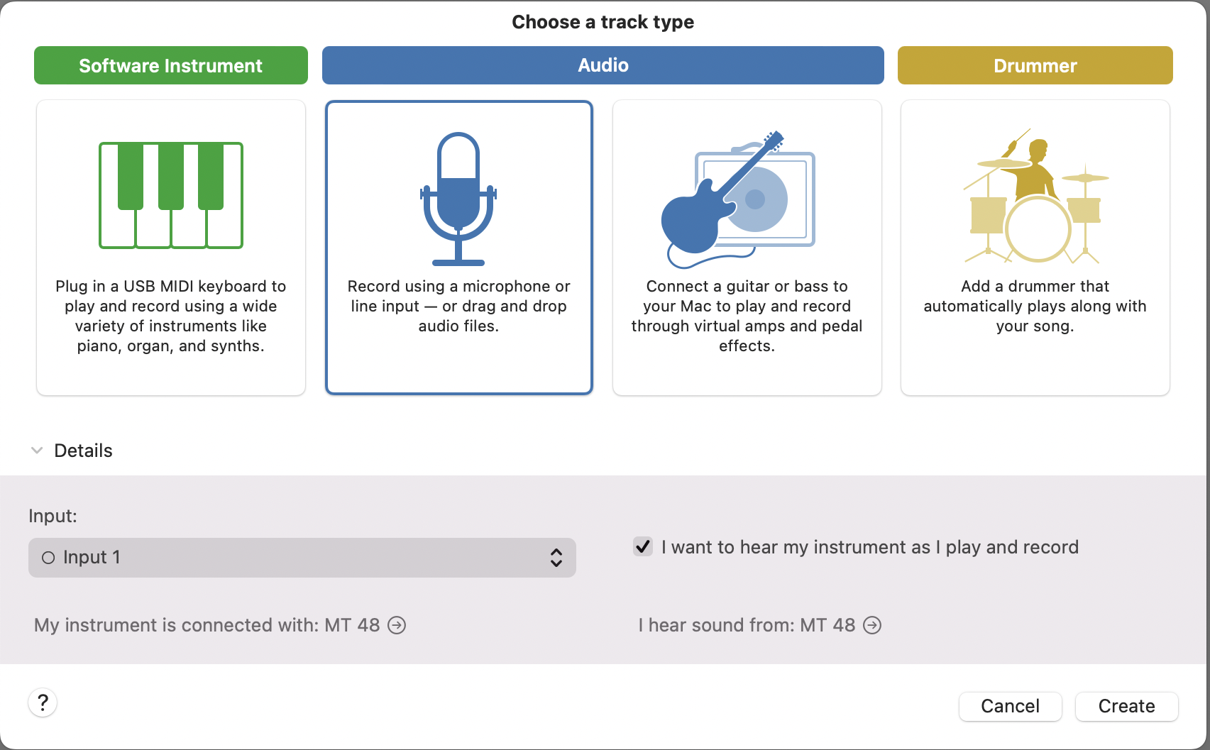 In the Preferences window, under Devices both the Output Device and Input Device should be the MT 48.
