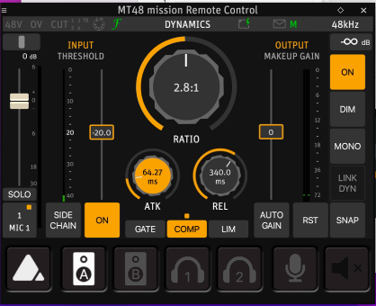 Gain - rotary knob in the center controlling input level. This can be controlled using the rotary knob on the mixer itself, or your mouse scroll wheel if using the Remote Control application on your computer. This is where you will set your input signal level before recording