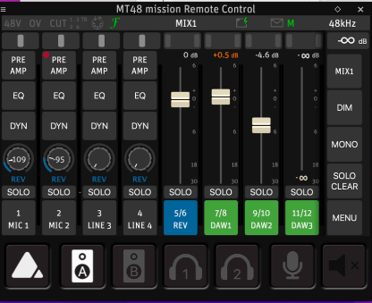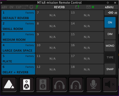 This can be adjusted per mix (1-4.)To open Reverb, highlight the track and click the Triangle menu button; or, single click in the Remote Control app and select Edit Rev.