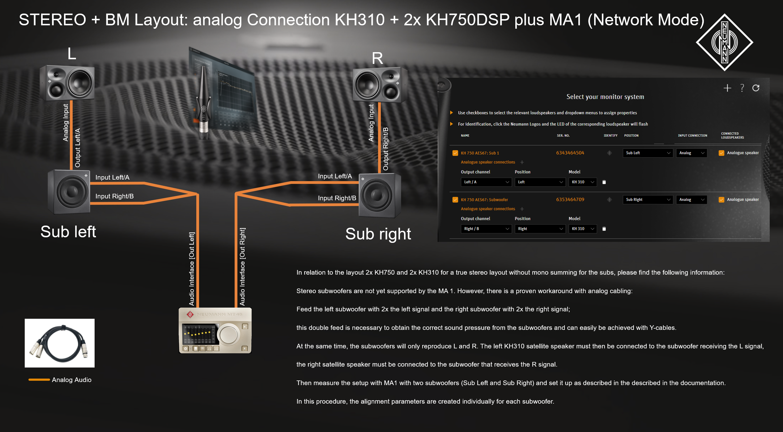Al mismo tiempo, los subwoofers solo reproducirán L y R. El altavoz satélite izquierdo KH310 debe conectarse entonces al subwoofer que recibe la señal L, el altavoz satélite derecho debe conectarse al subwoofer que recibe la señal R.