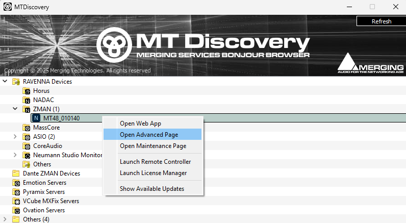 O puedes instalar "MT Discovery" que está disponible gratuitamente en el sitio web de Neumann | Servicio y Descargas. Aquí puedes elegir la "Página Avanzada" desde el menú.