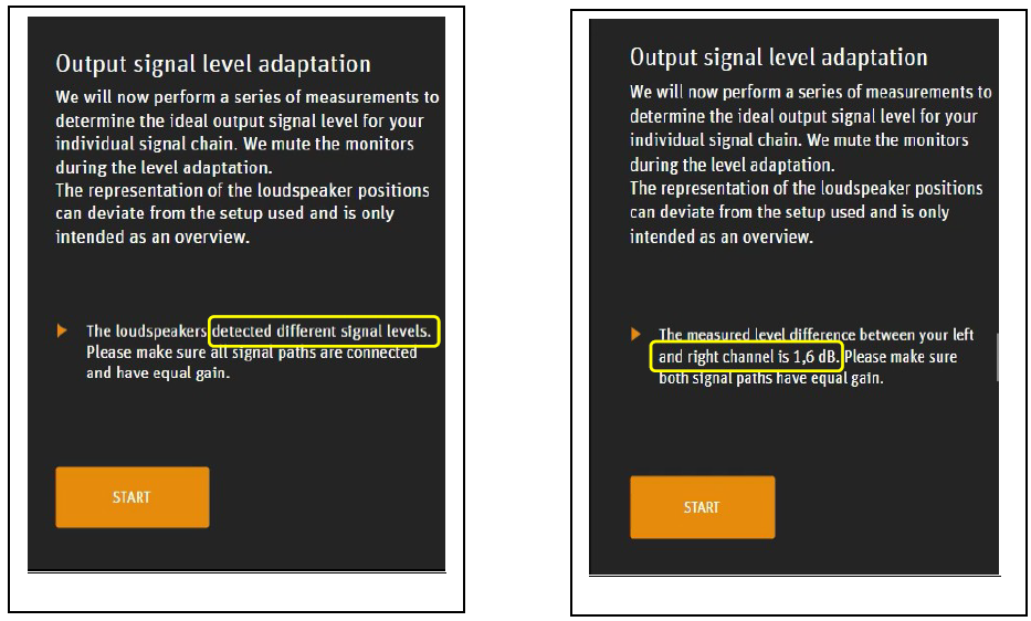 Dependiendo del escenario de medición, también puede aparecer un mensaje indicando que el volumen es demasiado bajo. Este mensaje también puede generarse si los altavoces no están conectados correctamente o, por ejemplo, un controlador de monitores intermedio está silenciado o la señal está mal enrutada o hay un cable/conexión defectuosa.