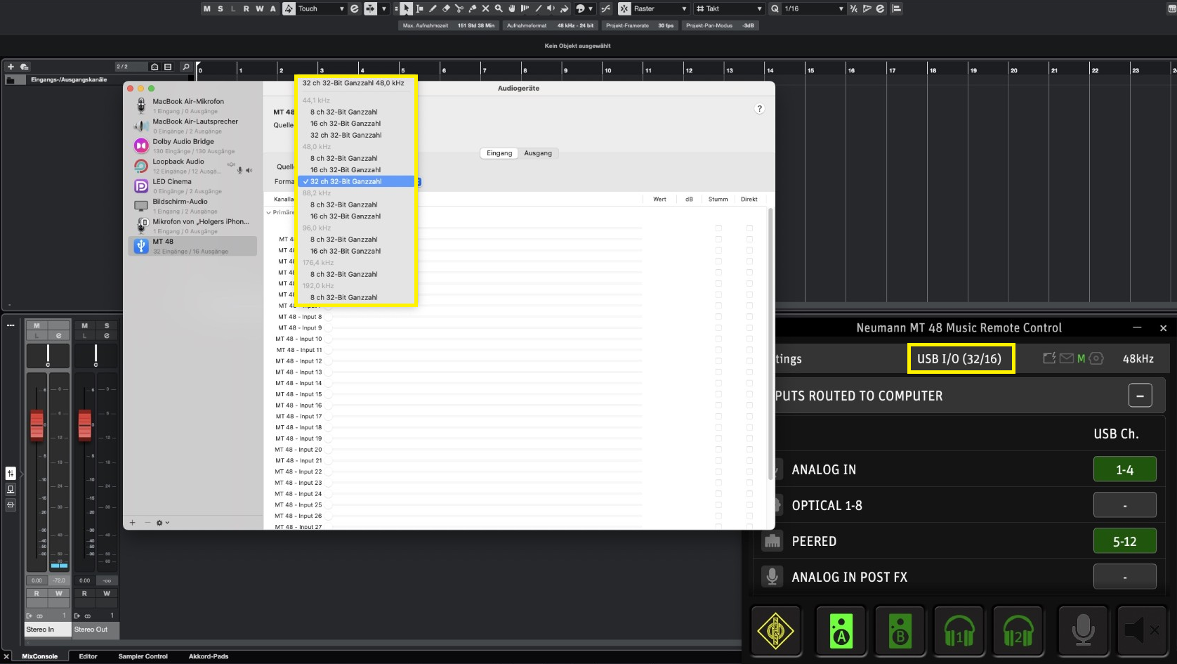 Notez que le pilote MT48 MacOS peut réduire le nombre de canaux USB dans le menu Configuration Audio MIDI. Si vous constatez une limitation sur votre MT48 qui empêche l'utilisation de tous ces 32 canaux d'entrée, veuillez vérifier les paramètres du pilote de périphérique audio.