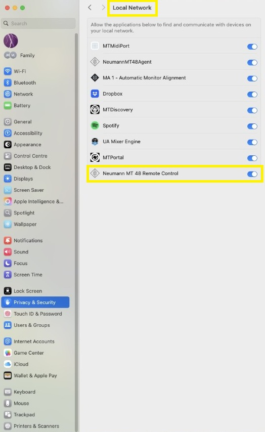 - 이미 켜져 있지 않다면 "Neumann MT48 Remote Control"을 활성화합니다