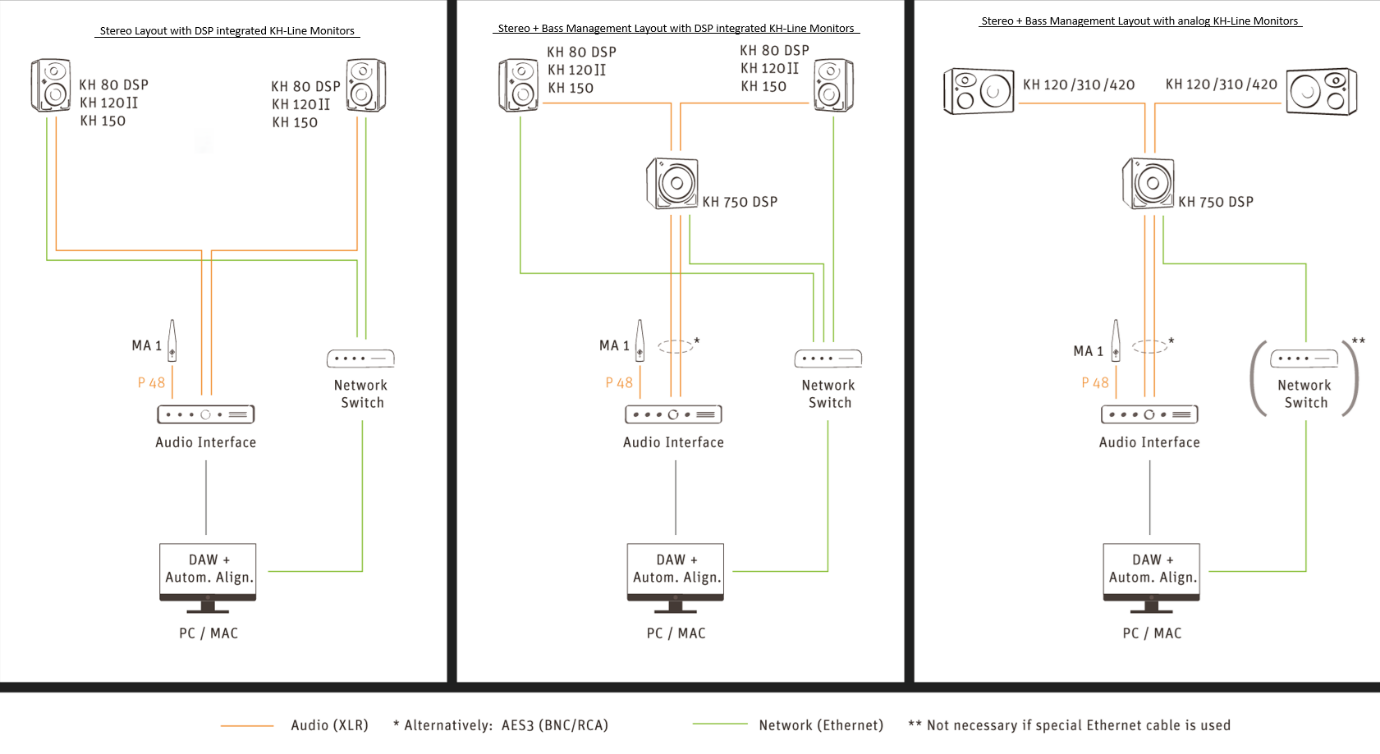Naast de correcte bekabeling voor de audiosignalen (aangegeven in oranje) is ook een netwerkverbinding van de monitoren naar een netwerk-switch vereist zodat MA1 werkt (aangegeven in groen). De computer met de MA1-software moet ook op deze netwerk-switch zijn aangesloten en zich in hetzelfde IP-subnet bevinden als de monitoren.